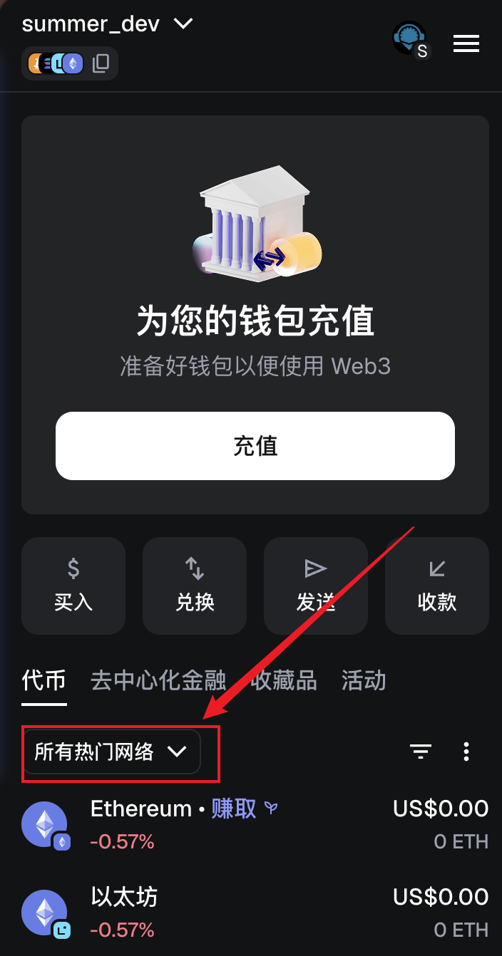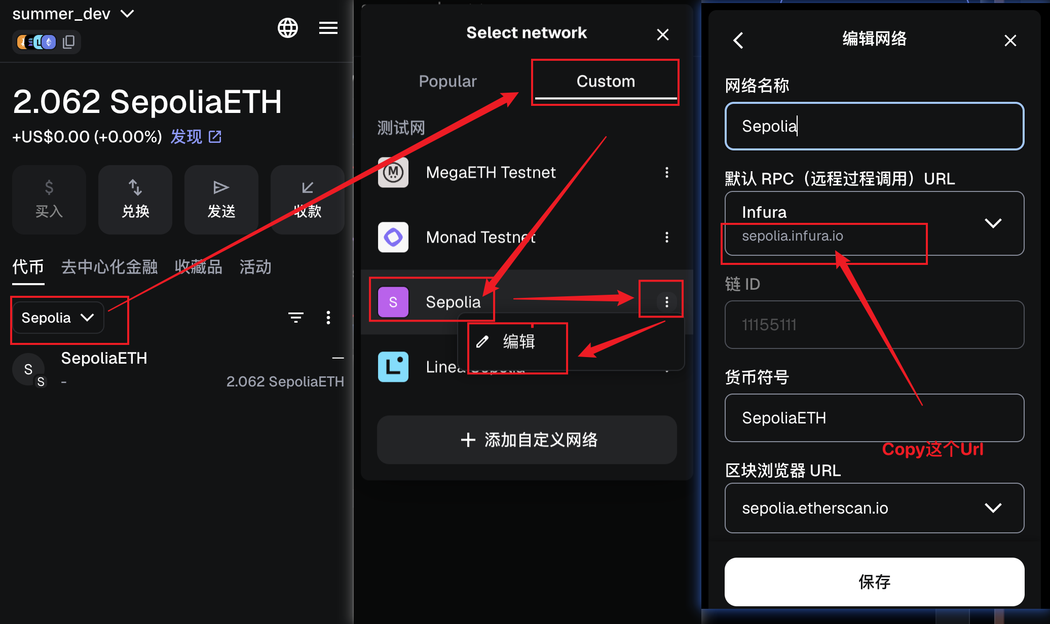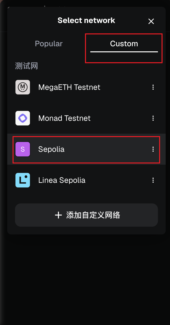 选择人们网络,找到Custom,选择Sepolia,Sepolia是免费测试研发使用的代币