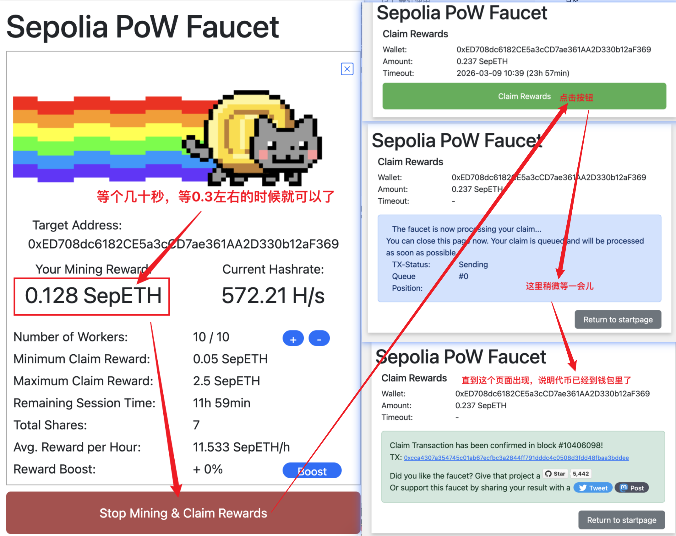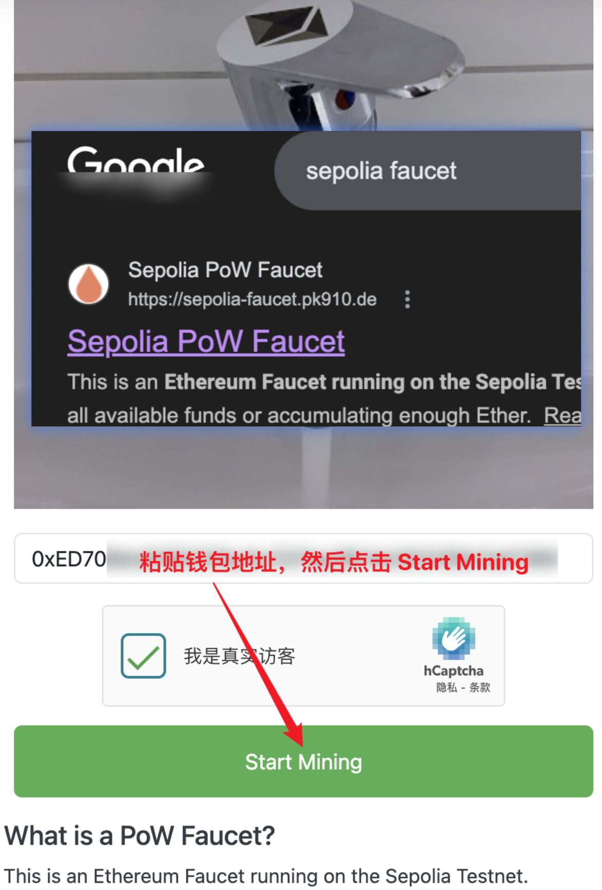 搜索找到 Sepolia PoW Faucet,免费领取代币,像图中一样。