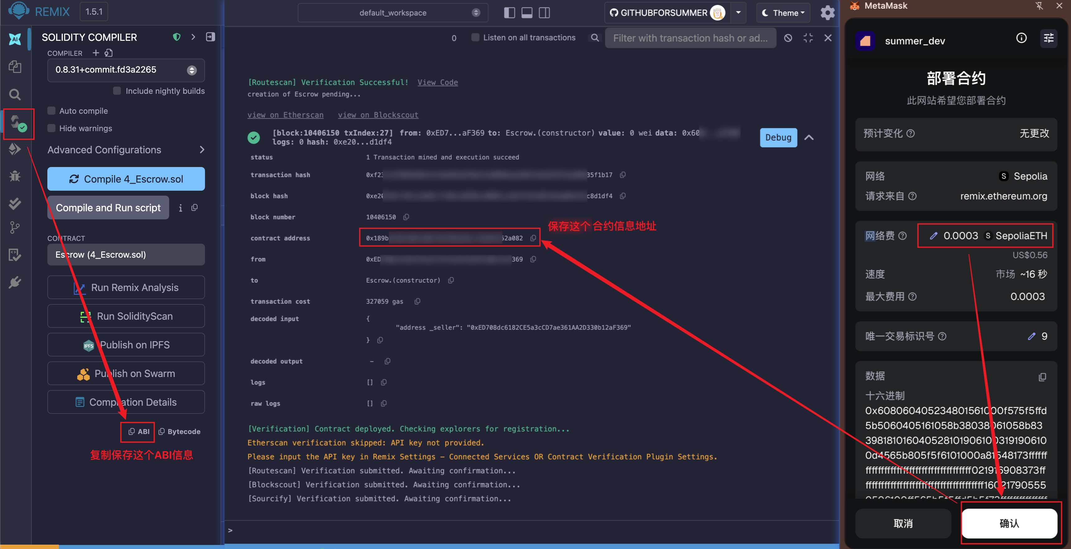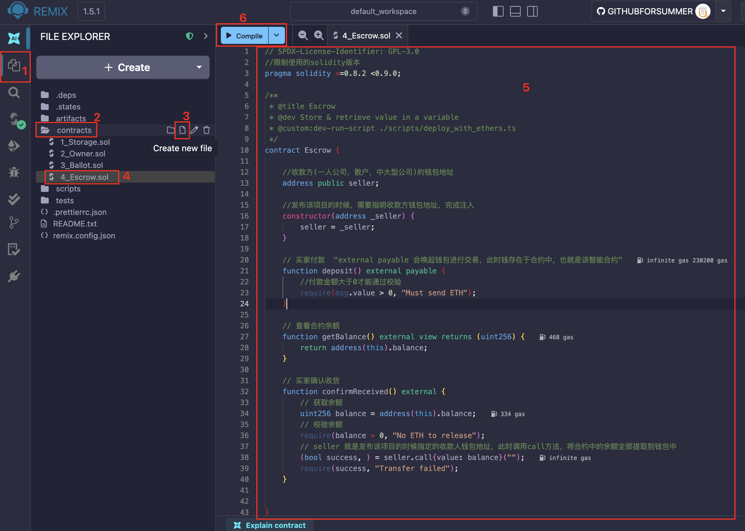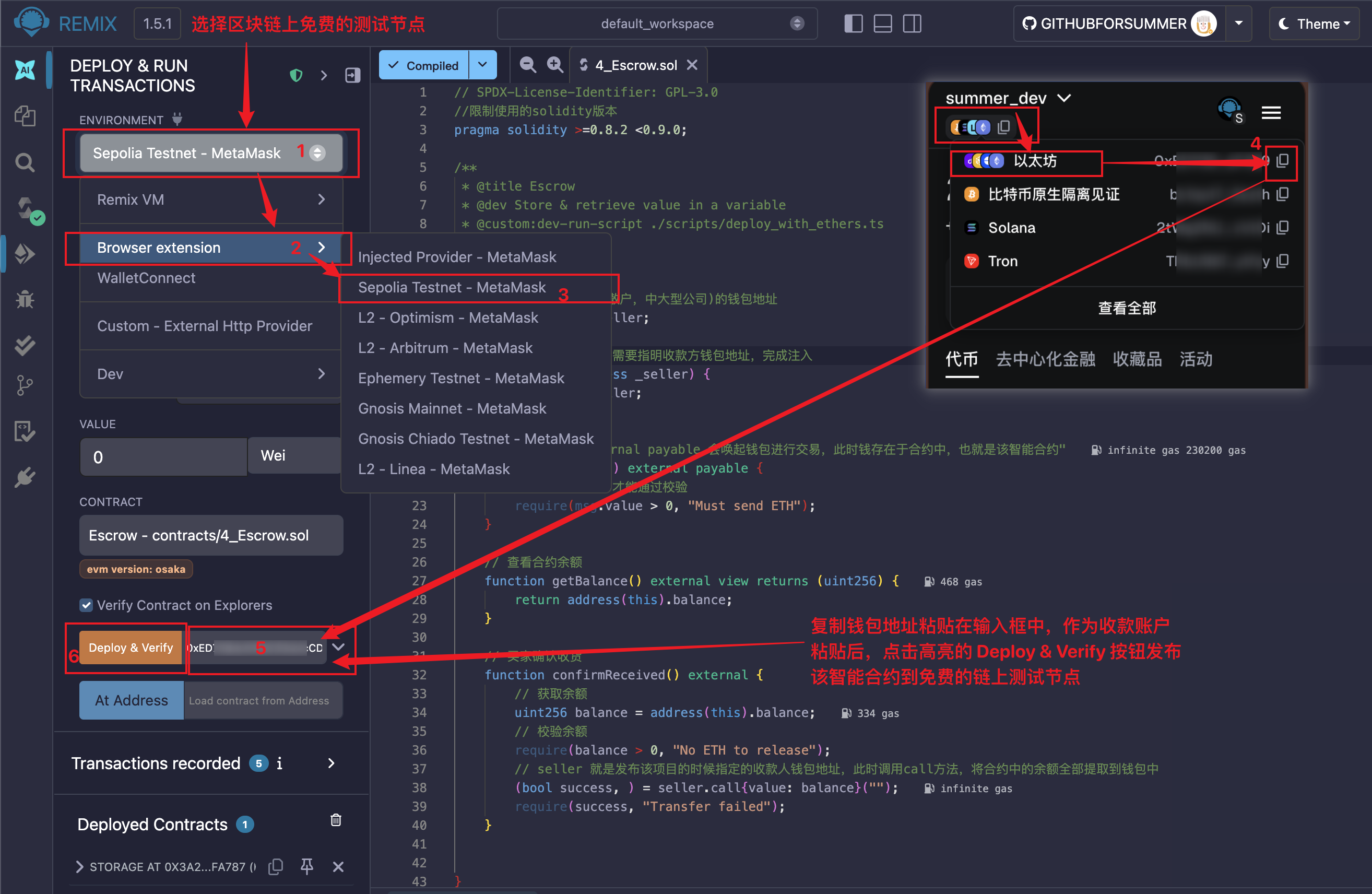 打开 remix.ethereum.org ,如下图所示,将上方的智能合约代码按照图中的步骤创建文件,粘贴代码,编译上传到链上节点。