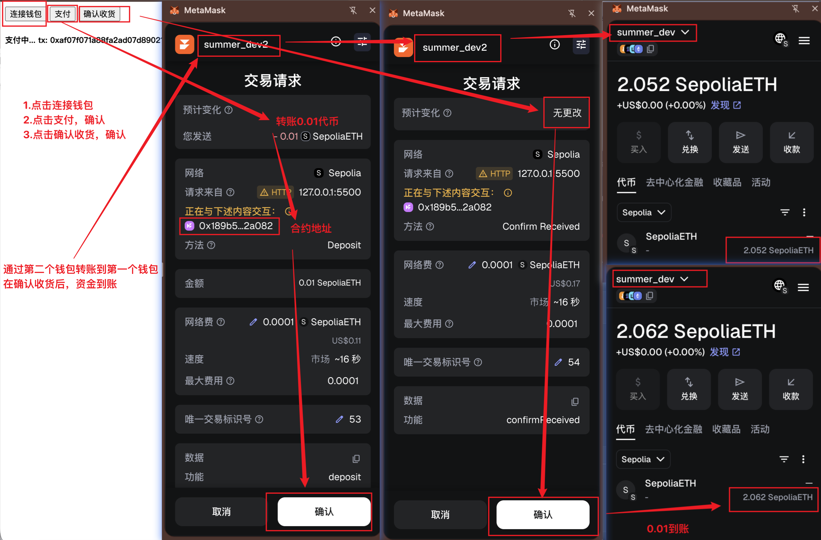 可以通过创建新的账户,领取免费的测试Sepolia代币,往直前的账户里支付,确认收货,发现金额正常的增加,交易成功。