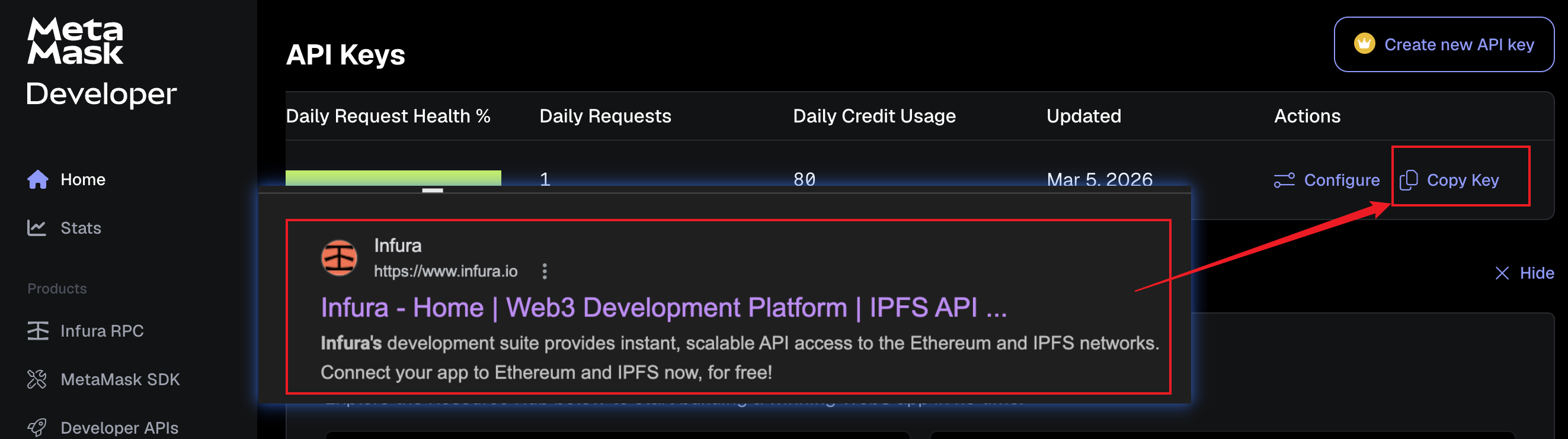 首先,需要注册一个key用来连接链上RPC,infura注册就可以免费用一个key,注册后跟着页面提示操作后,copy对应的key